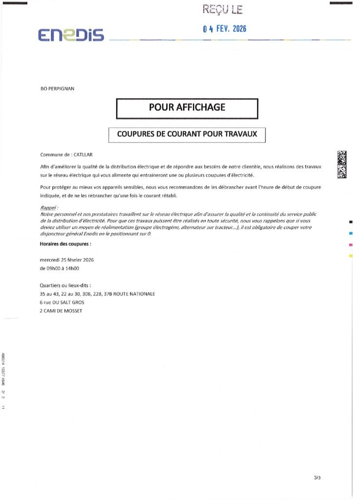 ENEDIS vous informe que la réalisation de travaux sur le réseau électrique entraînera des coupures de courant.